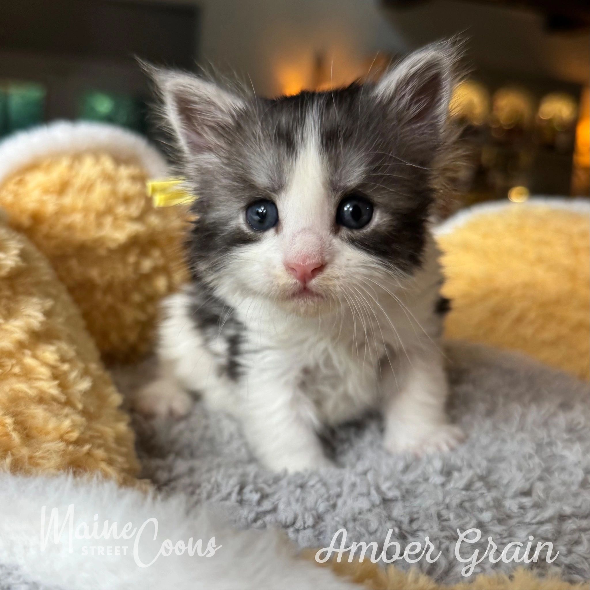 A precious black silver and high white girl with a name that reflects the golden fields that stretch across the American landscape, a tribute to the natural beauty that defines her breed and our country. A true American original, Amber Grain is a kitten ready to bring warmth, love, and a touch of Americana to her new home.