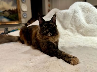 Meet MaineStCoons Soul Survivor, affectionately known as Soul—a strikingly beautiful and impressively large black tortie who embodies everything we love about the Maine Coon breed. Born right here in November 2023, Soul has grown into a truly exceptional cat with a personality as vibrant as her stunning coat. Her intelligence is nothing short of remarkable—she’s wicked-smart, always curious, and eager to engage in playful antics that keep us endlessly entertained. Whether she’s fetching her favorite toy or showing off her clever tricks, Soul’s zest for life is absolutely infectious.