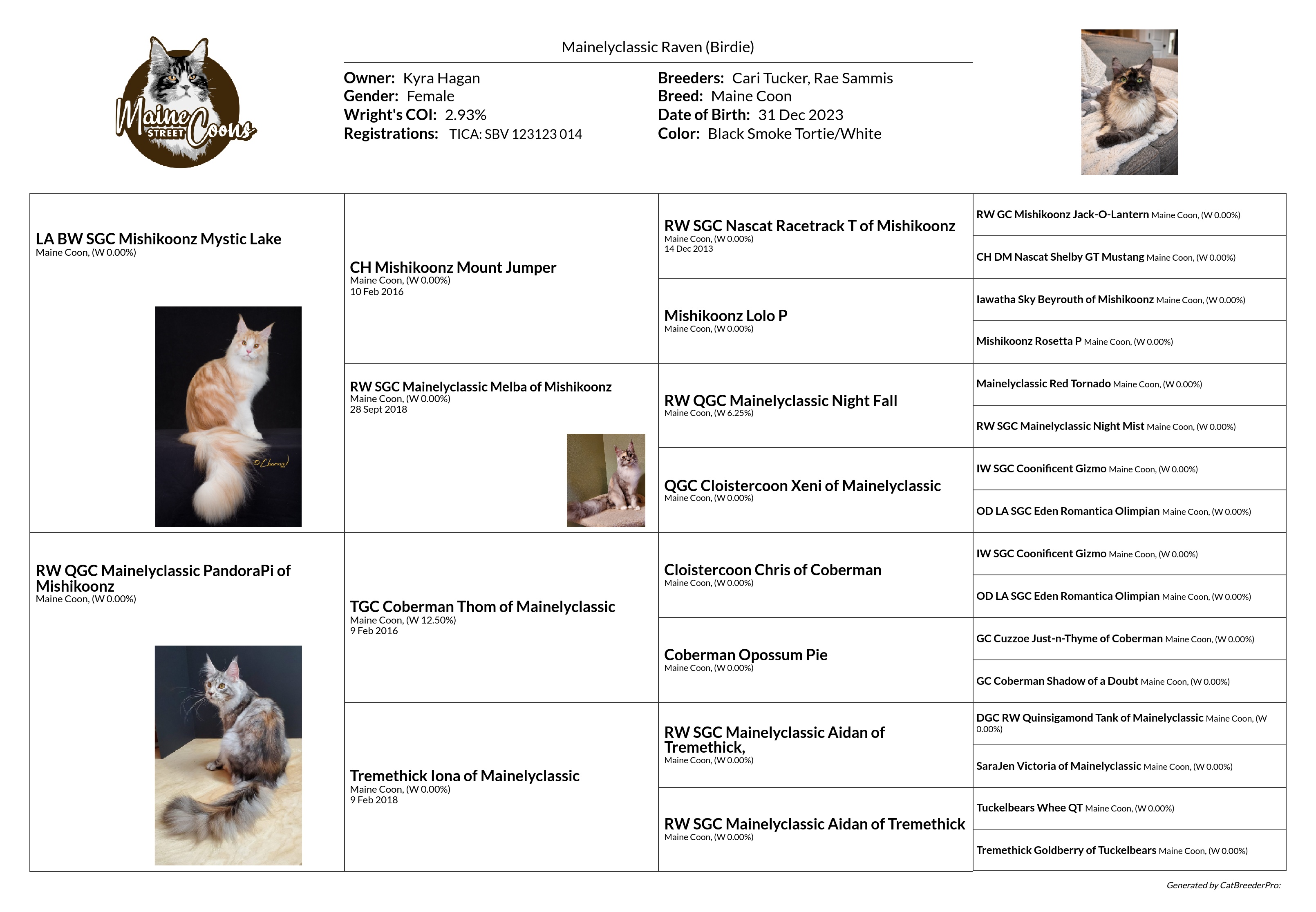 Affectionately known as Birdie, Mainelyclassic Raven is the embodiment of grace, charm, and timeless beauty. As the daughter of the legendary LA BW SGC Mishikoonz Mystic Lake and the stunning RW QGC Mainelyclassic PandoraPi of Mishikoonz, Birdie carries an impeccable pedigree that shines in every aspect of her being.