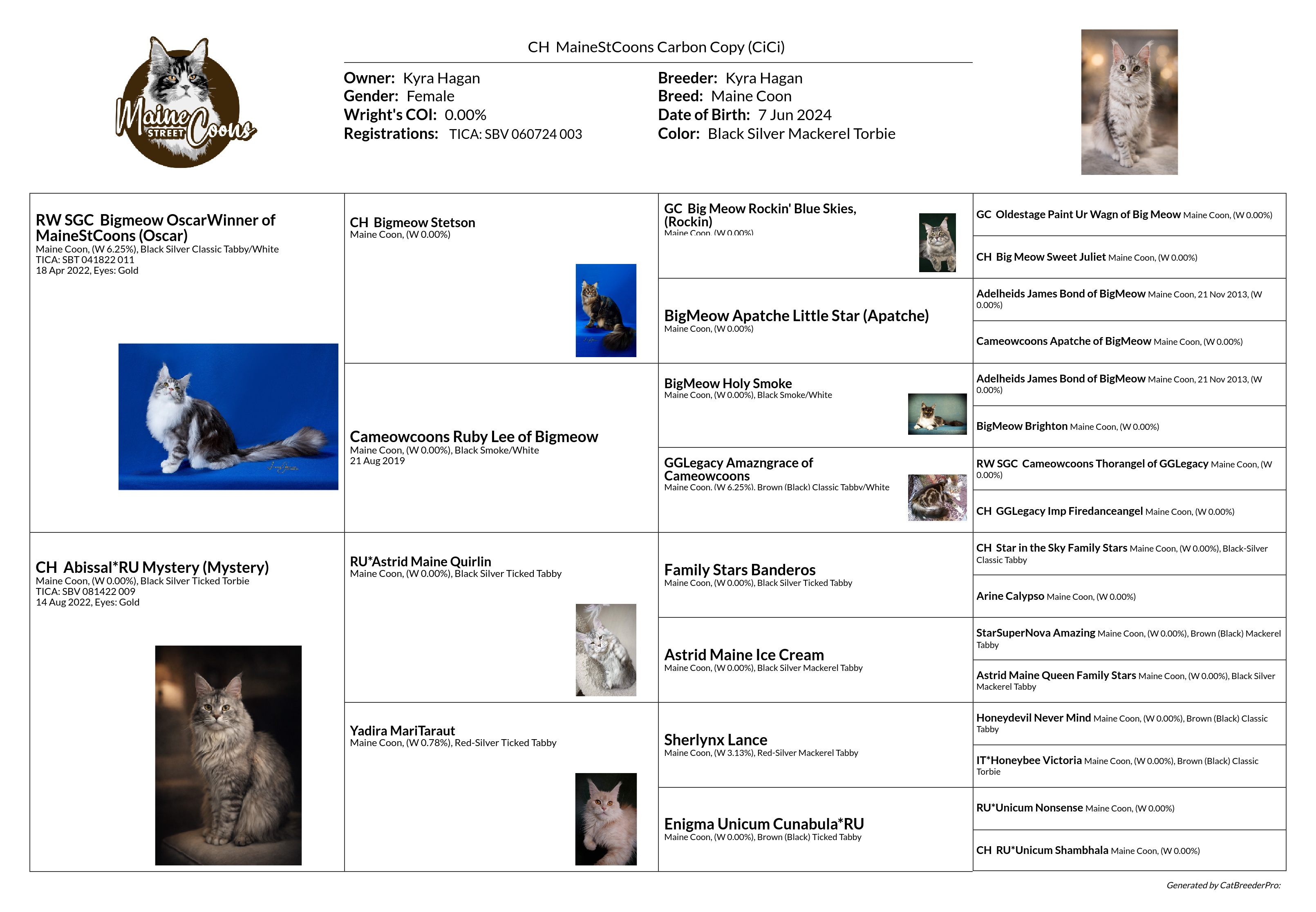 Lovingly known as CiCi, CH MaineStCoons Carbon Copy is the dream we always hoped for. Born in June 2023 to our beloved foundation queen CH Abissal Mystery and the dashing RW SGC Bigmeow OscarWinner, CiCi is the perfect blend of her parents’ charm, beauty, and exceptional qualities. With her striking black silver torbie coat and captivating personality, she’s nothing short of a showstopper.