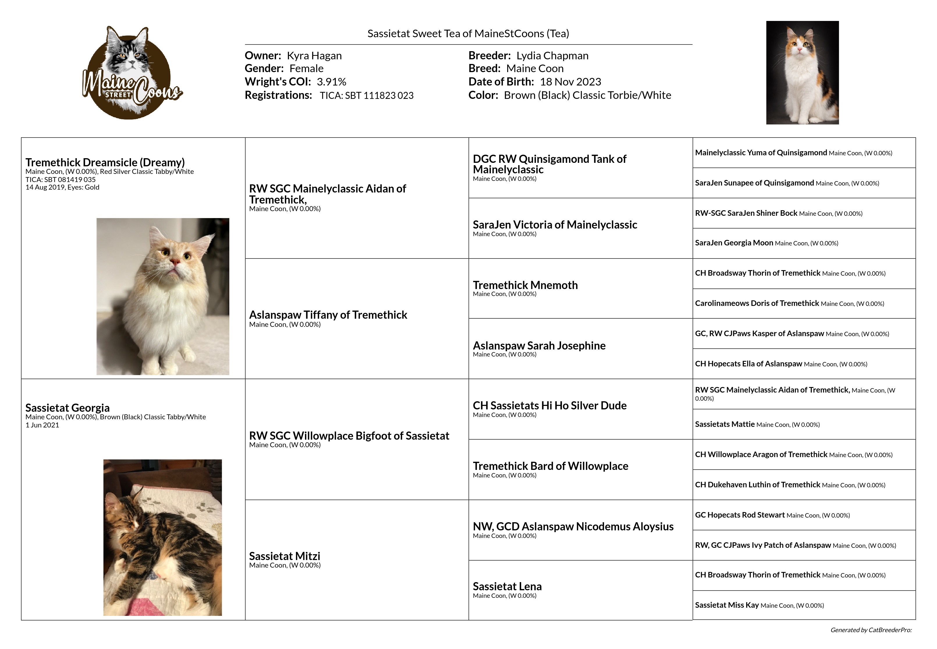 Sweet Tea is a precious gift to our program, a stunning black classic torbie with white—commonly referred to as "calico"—from the renowned Lydia Chapman of Sassietats. True to her name, Sweet Tea is as sugary sweet as they come, with the biggest, most soulful eyes that melt hearts instantly. Her lineage is nothing short of extraordinary, hailing from a long line of TICA show-winning cats, and her pedigree is a testament to her exceptional quality.