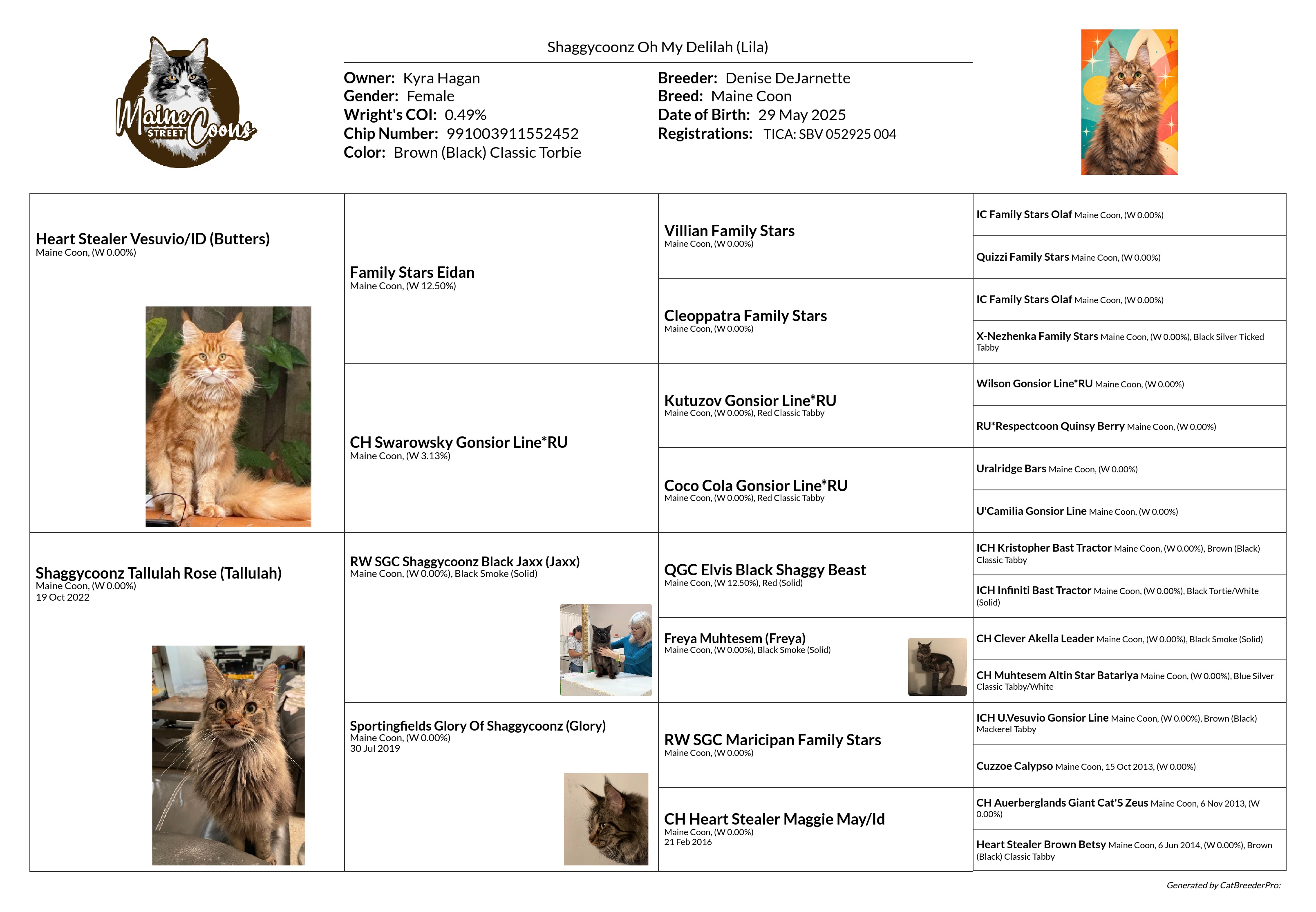 Affectionately known as Delilah, Shaggycoonz Oh My Delilah is a drop-dead gorgeous black classic torbie who joined us from our wonderful friends Denise DeJarnette and Lori McGill in St. Petersburg, Florida. With her vibrant colors, luxurious coat, and playful personality, Delilah is the perfect mix of beauty and mischief.