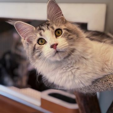 MaineStCoons Uptown Girl, affectionately known as Girly—a stunning black silver tabby with high white, born July 2024 to the regal Oscar and Rumba. With her luscious coat, large boning, and bold pattern, she exudes a royal, majestic presence. Her sweet, playful temperament is matched only by her striking balance of feminine grace and untamed, savage beauty. Girly is the epitome of elegance and charm, wrapped in a truly unforgettable package. You can view Girly's pedigree online.