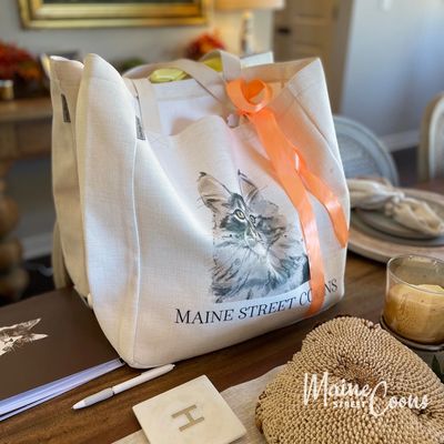 We spoil every baby from the moment they're born until they leave us, including sending them on their way in style! Every kitten leaves Maine Street with a quality Maine Street Coons canvas tote bag full of wet and dry food, supplements, treats, toys, and all the grooming essentials needed to continue to live the good life to which they've become accustomed!
